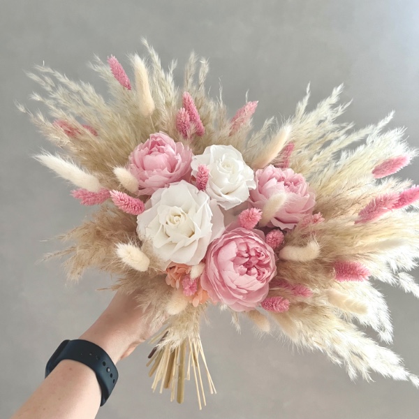 Букет невесты из сухоцветов и стабилизированных цветов будет радовать вас не менее года. В составе живые цветы обработаны спец составом ( глицерин) не требует воды, особого ухода