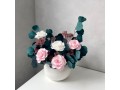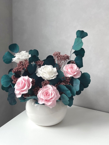 Букет выполнен из стабилизированных цветов, это живые цветы, которые напитаны спец составом, чаще всего это глицерин. Будет радовать более года